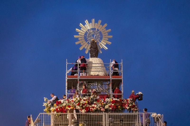 Sobre las 11,30 horas se ha ido formando el manto de la Virgen, que en esta ocasión está formado por claveles de color blanco, y la Cruz de Lorena que siempre es de color rojo. Bajo el mismo, se ha ido completando de flores multicolores la estructura piramidal que mide más de 15 metros de altura. Tiene una superficie en planta de 27,03 x 16,70 metros, pesa 40 toneladas y una capacidad aproximada para acoger 7.000.000 de flores. La imagen, construida en fibra de poliester, pesa 15 kg y mide 1,43 metros. La corona con resplandores tiene un diámetro de 2,64 ,etros. Por otra parte, el manto mide 2,50 metros de altura, siendo el total de su altura de 6,70 metros y pesa unos 525 kg, sin contar las flores. Este montaje de la ofrenda ideado por Bigas Luna celebra este 2023 sus 25 años.