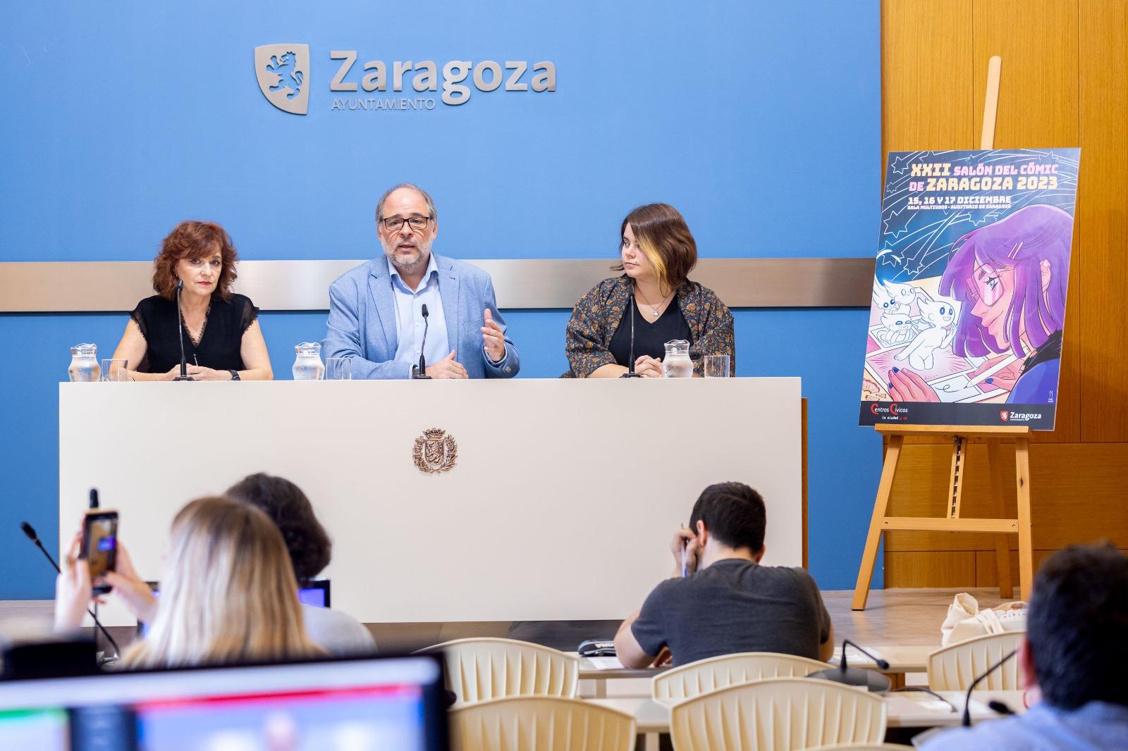 El consejero de Participación y Régimen Interior, Alfonso Mendoza, ha presentado el cartel, junto a la ilustradora Sara Soler, en una rueda de prensa en la que han informado que el Salón del Cómic se celebrará un año más en diciembre en la sala Multiusos de Zaragoza, por la que el año pasado pasaron cerca de 13.000 visitantes.