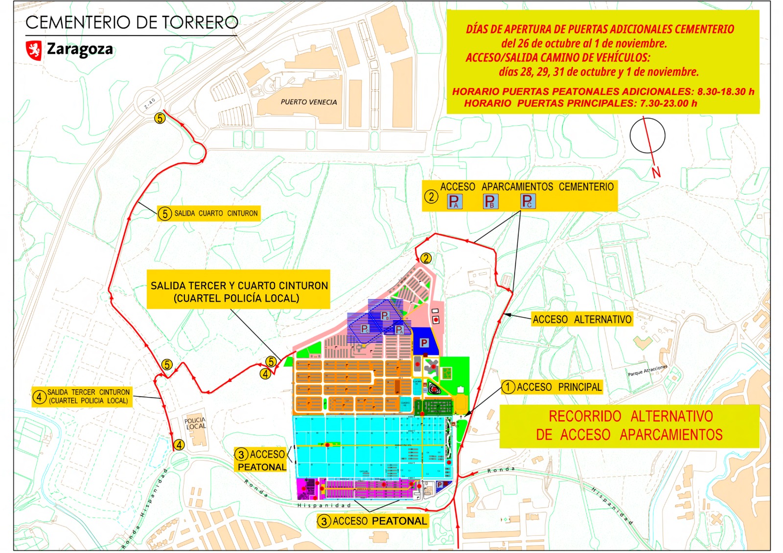 En el camposanto zaragozano se abrirán los siete accesos peatonales. Los dos principales son la puerta antigua del cementerio (de 6.30 a 21.00 horas) y la de acceso al tanatorio por la zona de la Cruz de los Caídos desde Fray Julián Garcés (de 6.30 hasta 23.00 horas). A estas se suman cinco accesos peatonales adicionales, de 8.30 a 18.30 horas: la de acceso al tanatorio, los dos por el Tercer Cinturón, el del andador de la Fosa Común, y el andador B. En el caso del Servicio de Portería y préstamos de escaleras estará disponible de 9.00 a 14.00 horas y de 15.00 a 18.00 horas.