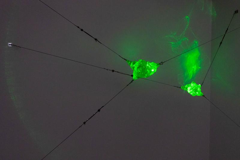 Carlos Sáez, artista multidisciplinar especializado en medios digitales, inicia la exposición con Neûron, obra con la que rompe el concepto tradicional entre el ser humano y la tecnología. Históricamente esta relación ha sido de confrontación, hoy en día ya no existe la división entre estos dos mundos antagónicos que han luchado por imponerse mutuamente. El láser, elemento esencial en la obra de Sáez, actúa como metáfora de esta simbiosis, un rayo de luz que podemos ver, pero no tocar.