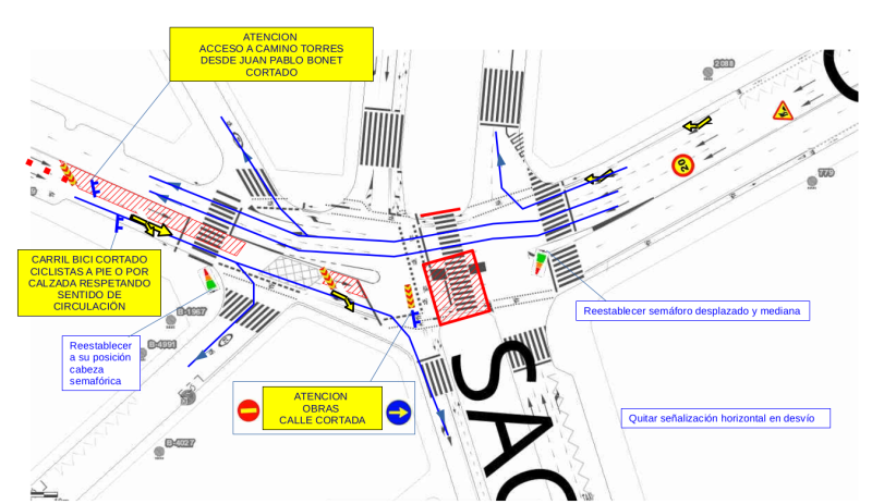 A partir del lunes 12 de febrero se realizará la segunda fase en el cruce, garantizando el tráfico procedente de Camino de las Torres a Juan Pablo Bonet (que recupera su sentido habitual) y desviando el sentido contrario. Esta vez, el tráfico procedente de San Juan de la Cruz deberá desviarse por Carrera del Sábado, Calle Sevilla, Glorieta Diego Velazquez y María Moliner o Paseo Sagasta para acceder a Camino de las Torres. Se podrá circular en un único carril en Juan Pablo Bonet para desviarse hacia la derecha bien por Gascón de Gotor o por Paseo Sagasta.