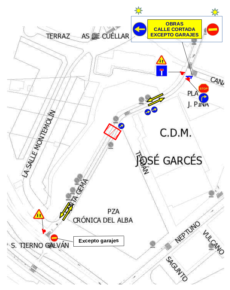 Para realizar una nueva acometida de vertido a la altura del número 19 de la calle de Santa Gema, del 12 al 15 de febrero, se cortará la vía (desde la calle del Canal por donde se desviará el tráfico), quedando en fondo de saco y doble sentido de circulación para la entrada y salida de garajes afectados (por calle del Canal o camino del Canal).