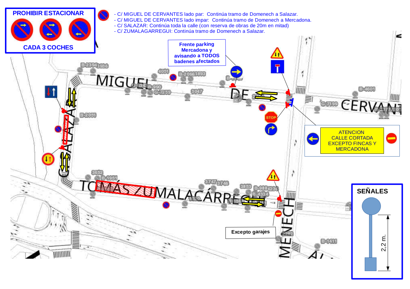 Para la renovación de la tubería de abastecimiento (tras la renovación del colector de saneamiento) entre las calles Catalina Salazar y Arzobispo Domenech, del 10 de febrero al 9 de marzo, permanecerá cortada la vía en dicho tramo. Los garajes afectados continuarán entrando y saliendo por Arzobispo Domenech bien desde Miguel de Cervantes o desde Zumalacárregui según el avance de la obra, quedando ambas calles y la Calle Salazar en fondo de saco y doble sentido de circulación. Se mantiene prohibido el estacionamiento en: el tramo afectado de Zumalacárregui, en toda la calle Salazar (donde se ubicará el material de obra) y en el tramo de Miguel de Cervantes entre Domenech y Salazar (salvo en el lado de los números pares entre Mercadona y la Calle Salazar).