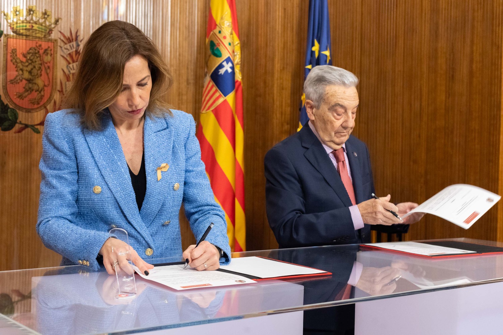 La alcaldesa de Zaragoza, Natalia Chueca, y José Luis Merino, presidente de la Academia Aragonesa de Jurisprudencia y Legislación han firmado este jueves un convenio de colaboración entre ambas instituciones con el fin de promover y difundir el Derecho aragonés, público y privado.