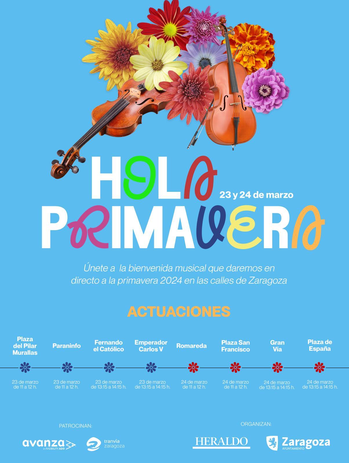"Hola Primavera" se estructurará en cinco pequeños escenarios tematizados con motivos primaverales y repartidos por la Plaza del Pilar, concretamente frente a la fachada principal de la Basílica y unidos por un manto verde, con el que formarán el denominado "Paseo del Arte". En estos escenarios se desarrollarán microactuaciones de diferentes disciplinas artísticas, con un marcado carácter aragonés.