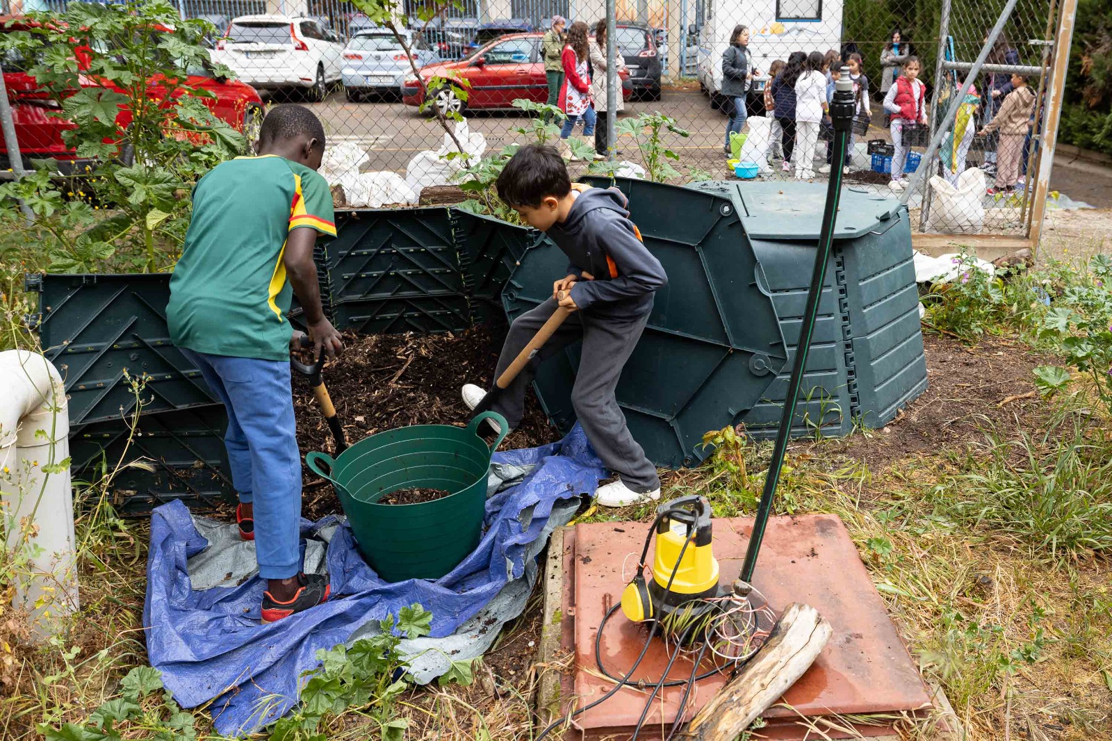 Los restos de la comida y de los almuerzos de los alumnos del colegio CEIP Ciudad de Zaragoza han servido para abonar hoy su huerto escolar. Los niños y niñas de este centro educativo zaragozano han realizado esta mañana la cosecha del compost que han ido produciendo a lo largo de los últimos meses, completando el ciclo de la economía circular.