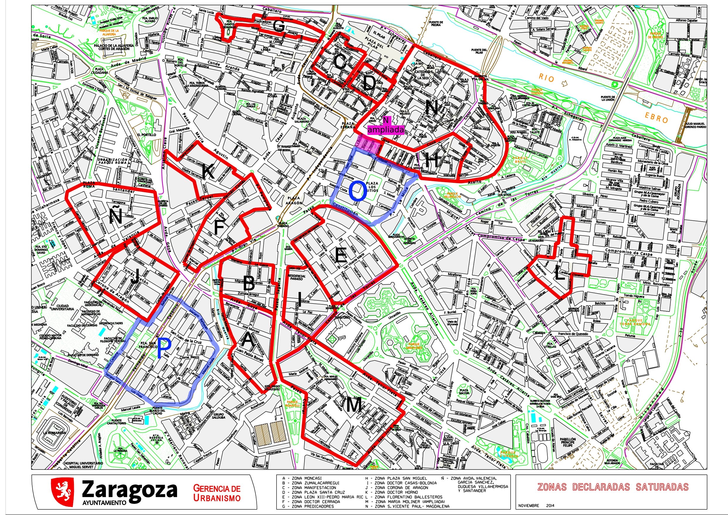 En la actualidad, Zaragoza cuenta con quince zonas catalogadas como saturadas, que se mantienen así desde su última revisión en 2005. En concreto se trata de las zonas: Moncasi, Zumalacárregui, Manifestación, plaza Santa Cruz, León XIII, Doctor Cerrada, Predicadores, plaza San Miguel, Doctor Casas, Corona de Aragón, Doctor Horno, Florentino Ballesteros, María Moliner, La Magdalena, y Avenida de Valencia-Santander.