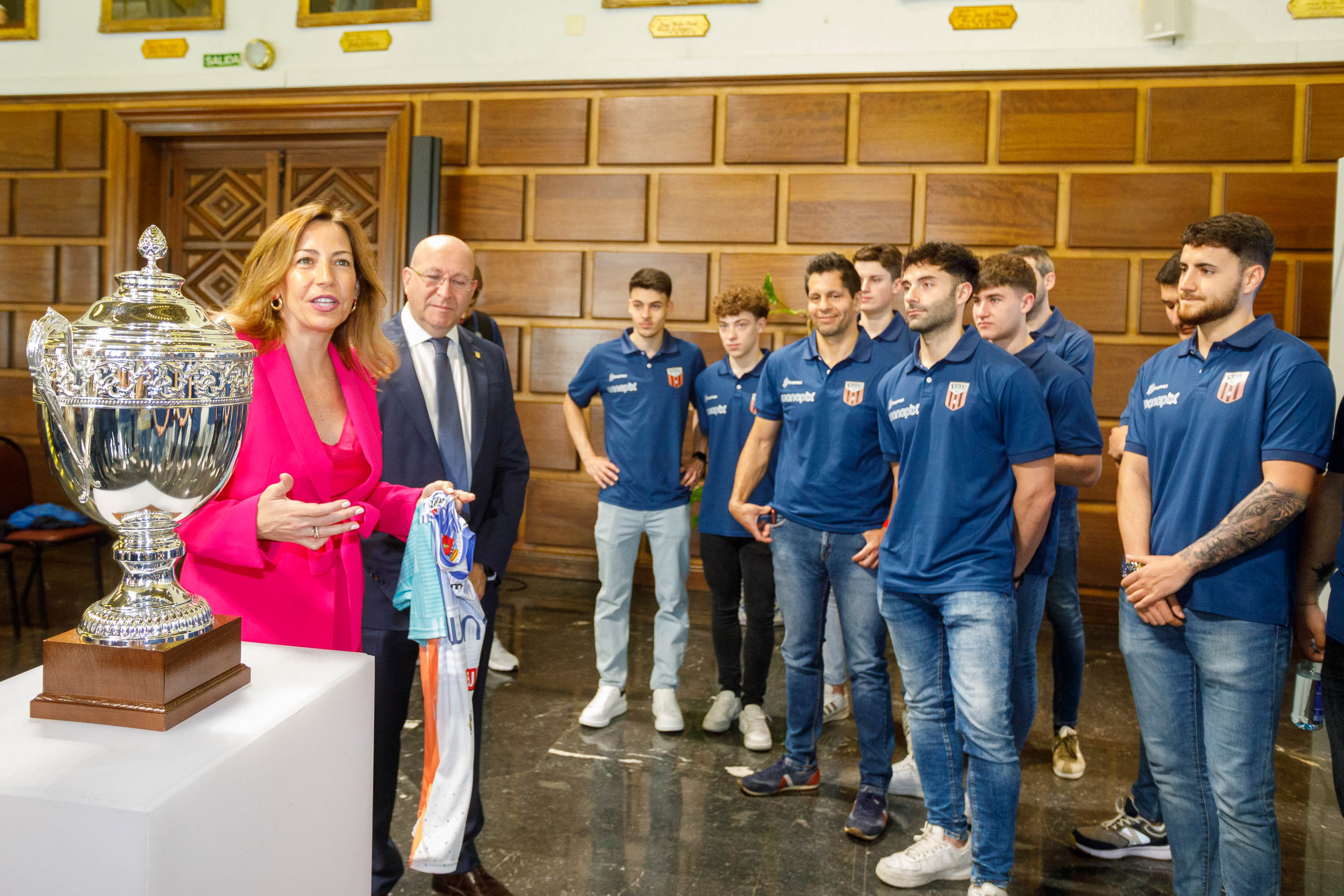 La alcaldesa de Zaragoza, Natalia Chueca -acompañada por el concejal de Deportes, Félix Brocate- ha recibido hoy a la plantilla, cuerpo técnico y directiva del Wanapix Sala 10, a quienes ha felicitado por el ascenso a la máxima categoría. El equipo ha visitado el Ayuntamiento con el trofeo de campeón de la división de plata.