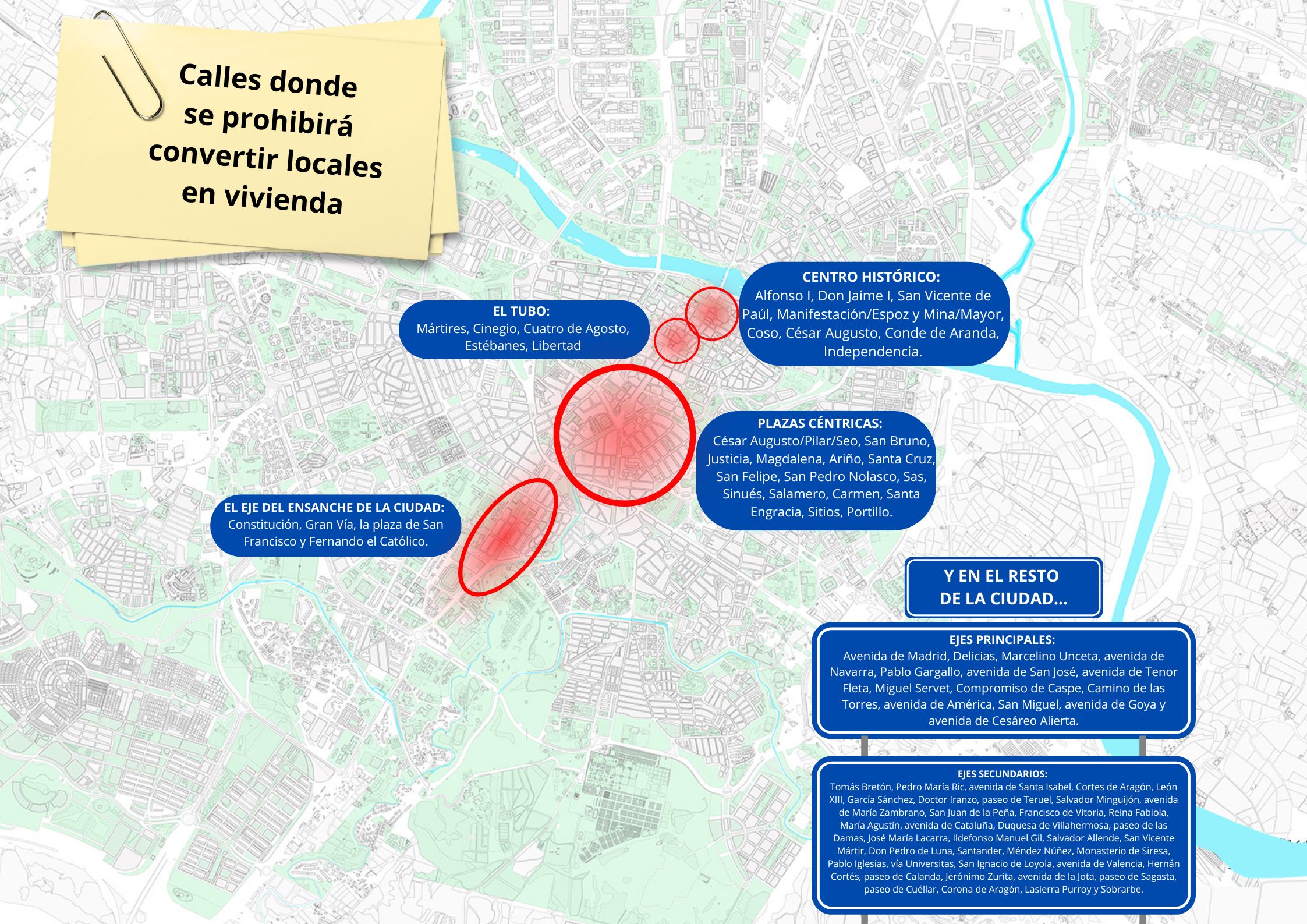 Las condiciones básicas para permitir este tipo de cambios de uso, que pueden consultarse a través de la página web del Ayuntamiento en las secciones de Urbanismo y Planeamiento https://www.zaragoza.es/contenidos/urbanismo/pgouz/MA176/Normas.pdf, suponen la transformación de un local que lleve sin actividad un mínimo de 36 meses (3 años) y tenga una altura mínima de 2,5 metros. Además, deberán tener un mínimo de 45 metros cuadrados, a no ser que sea un local mayor de 140 m2, para los que entonces se exigen pisos de mínimo 55 metros cuadrados. Asimismo, se exigen una serie de condiciones con las salidas de humos, la ventilación de los espacios, la iluminación exterior, los zaguanes o que el local no se sitúe en una de las principales arterias de la ciudad o de protección comercial. Todas estas condiciones se mantendrán.