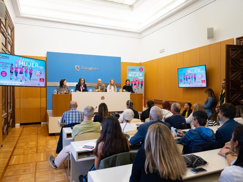 Fomentar el deporte femenino, luchar contra el cáncer de mama, contra la violencia de género y contra las desigualdades sociales que sufren las mujeres vuelven a ser los objetivos principales de la carrera, que hoy ha sido presentada en el Ayuntamiento de Zaragoza por Félix Brocate, concejal delegado de Deportes; Henar Calleja, portavoz de la organización; Esther García, paciente y socia de la Asociación Española de Cáncer de Mama Metastásico; Susana Álvarez, vicepresidenta de ATADES; y Sara Benedí, atleta ganadora de la Carrera de la Mujer de Zaragoza en 2023.