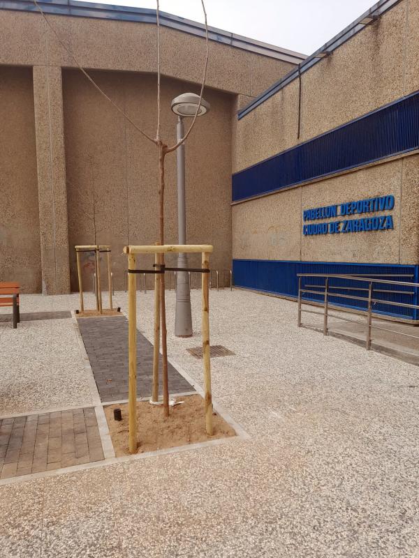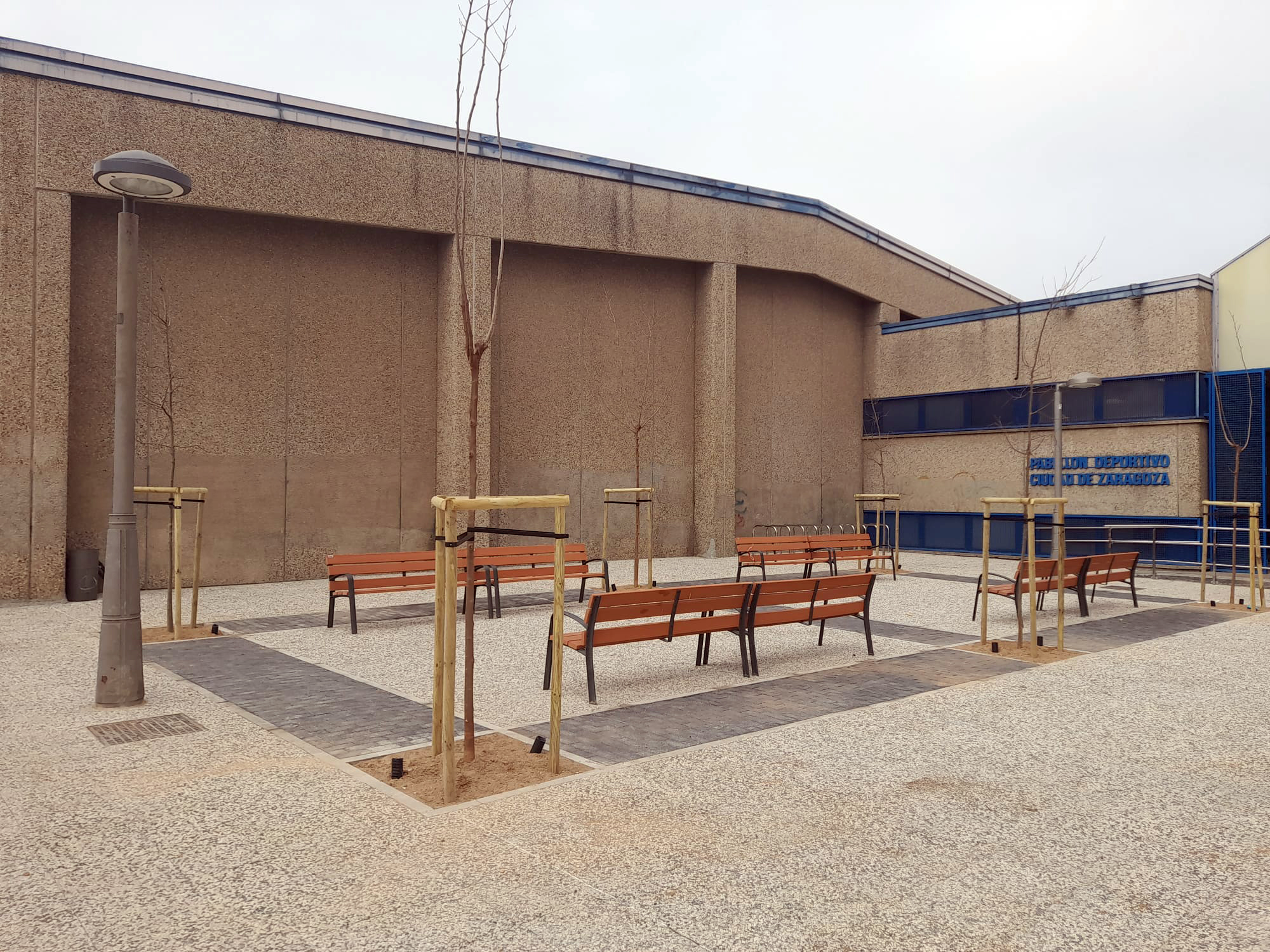 Se han reconfigurado también las zonas verdes con la plantación de nueve árboles de porte grande junto a los que se han instalado ocho bancos nuevos que recibirán su sombra cuando crezcan. Así mismo se han creado franjas en el suelo que conectan los alcorques dotadas con pavimento filtrante para ayudar al desarrollo del arbolado y realizar un drenaje que evite las escorrentías que afectaban al centro deportivo y otros edificios cercanos.