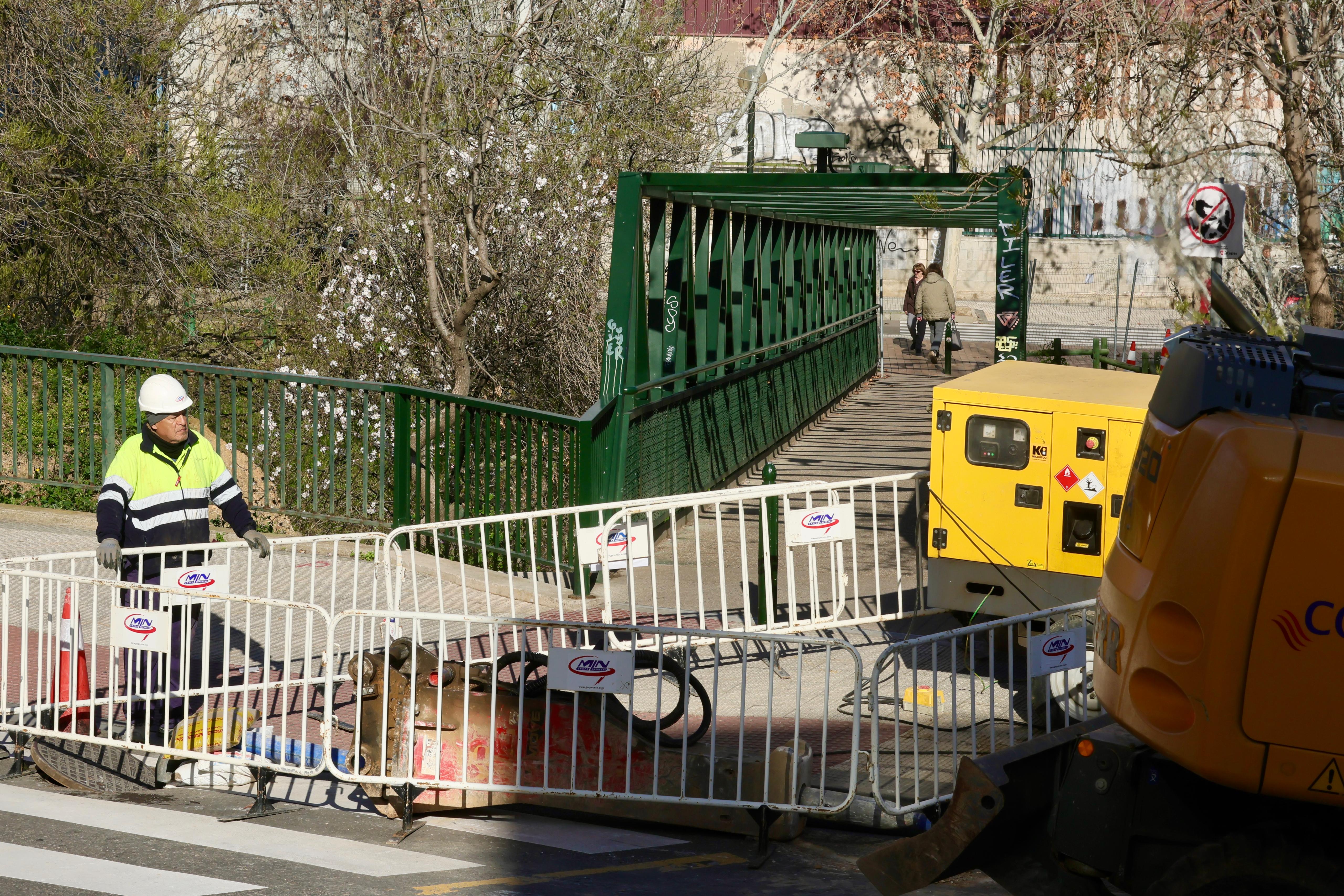 Los trabajos de renovación de la red de saneamiento que se están ejecutando obligarán a cortar, a partir de este jueves 20 de febrero, el tránsito por la pasarela peatonal que conecta las dos riberas.  Esta infraestructura, que tiene un alto uso por parte de los vecinos del entorno y de la comunidad educativa del CEIP Basilio Paraíso y del pabellón polideportivo La Salle-Gran Vía, permanecerá cerrada durante un mes para garantizar la seguridad durante la actuación.