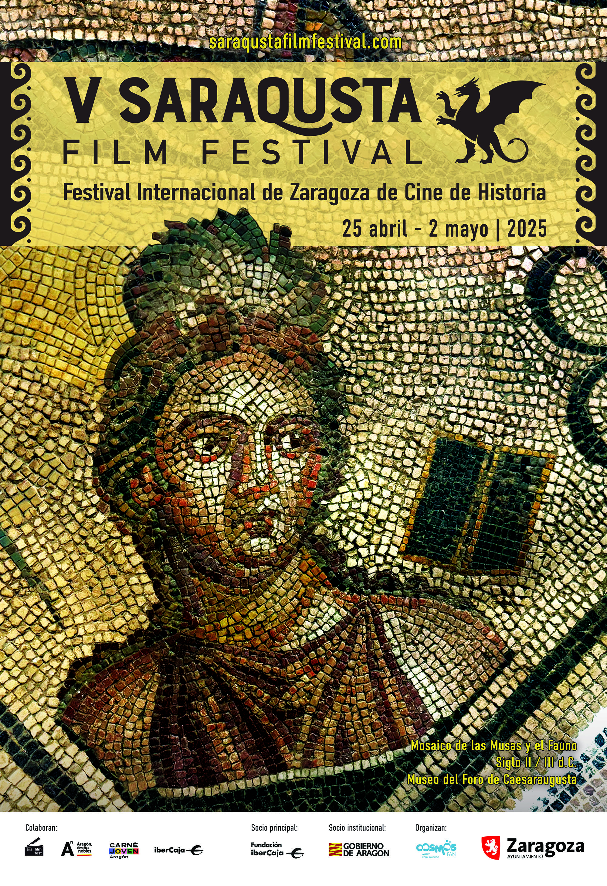 El cartel de Saraqusta Film Festival combina elementos culturales e históricos de manera creativa. Este año, el diseño ha corrido a cargo del responsable de la imagen del festival David Arenas y de la coordinadora de programación Patricia Naya, y muestra, a propuesta del Ayuntamiento de Zaragoza, un fragmento del mosaico romano 'Las musas y el fauno', fechado en los siglos II/III D.C, que se encuentra en el Museo del Foro de Caesaraugusta.