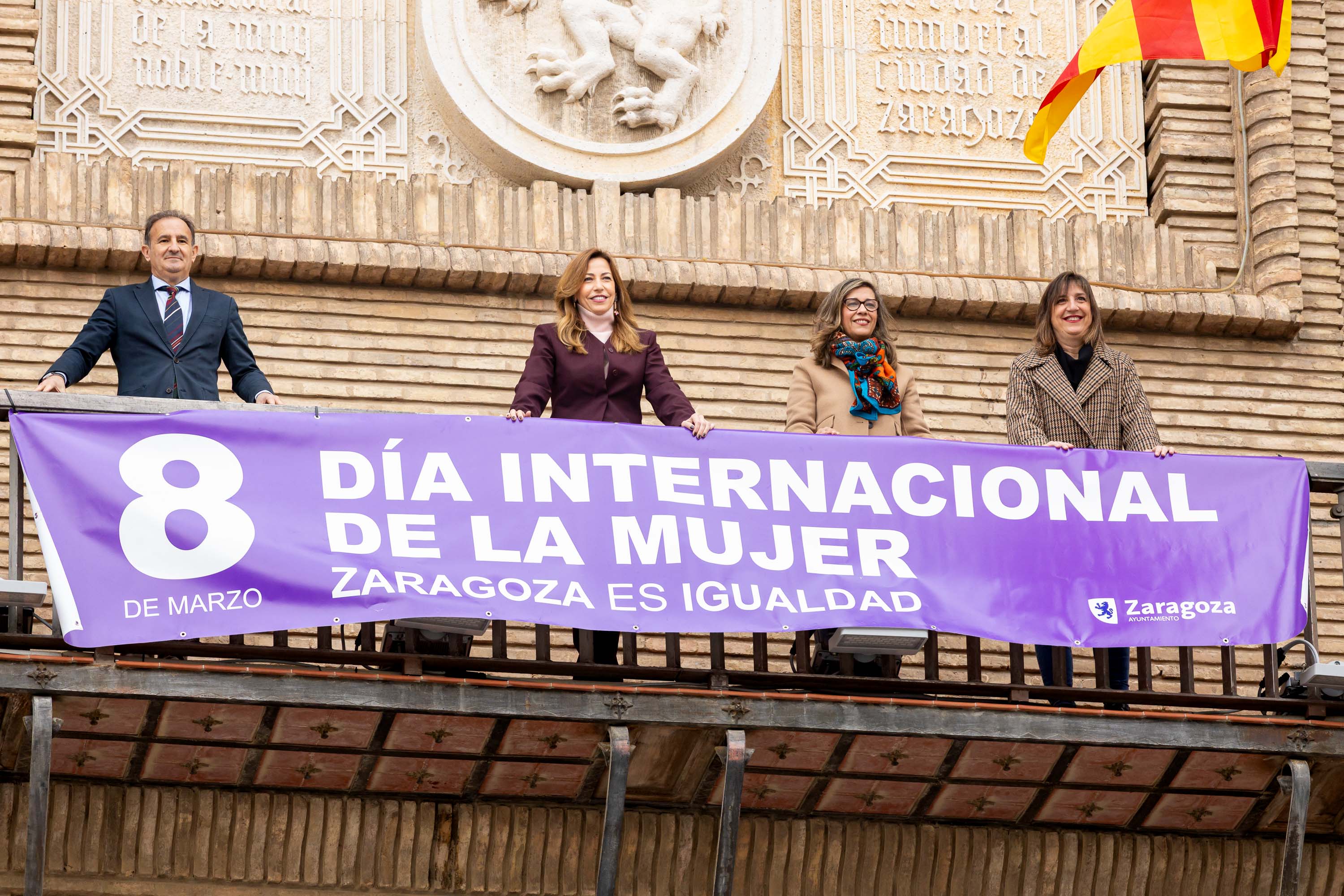 El balcón principal del Ayuntamiento de Zaragoza luce desde esta mañana la pancarta conmemorativa del Día Internacional de la Mujer. Con el lema 'Zaragoza es Igualdad' ha sido colocada la pancarta por la alcaldesa Natalia Chueca, acompañada por la consejera de Políticas Sociales y concejal delegada de Igualdad, Marian Orós, el consejero de Presidencia, Ángel Lorén, y la representante del grupo municipal del PSOE. Las principales fuentes de la ciudad se iluminarán esta noche de color morado.