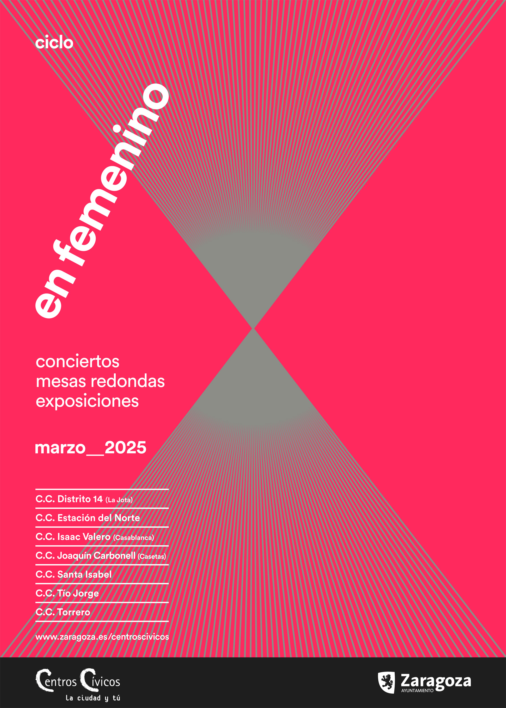 El ciclo de música 'En femenino' celebra este año su décimo aniversario con la participación de mujeres artistas, como Soleá Morente, que sonarán a los cuatro vientos desde el 14 hasta el 28 de marzo. El programa se desarrolla en siete centros cívicos de la ciudad, llegando a los diferentes barrios y distritos: Distrito 14, Tío Jorge, Estación del Norte, Isaac Valero, La Almozara, Santa Isabel y Torrero).