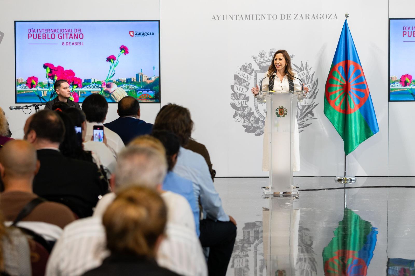 La alcaldesa Natalia Chueca ha presidido el acto institucional, en el que también han intervenido la consejera municipal de Políticas Sociales, Marian Orós, la consejera de Bienestar Social y Familia del Gobierno de Aragón, Carmen Susín, y Esther Jiménez, que ha leído el manifiesto en representación de las entidades gitanas: Federación de Asociaciones Gitanas de Aragón, Asociación de Promoción Gitana, Asociación de Mujeres Independientes Gitanas (AMIGA) y la Fundación Secretariado Gitano.
