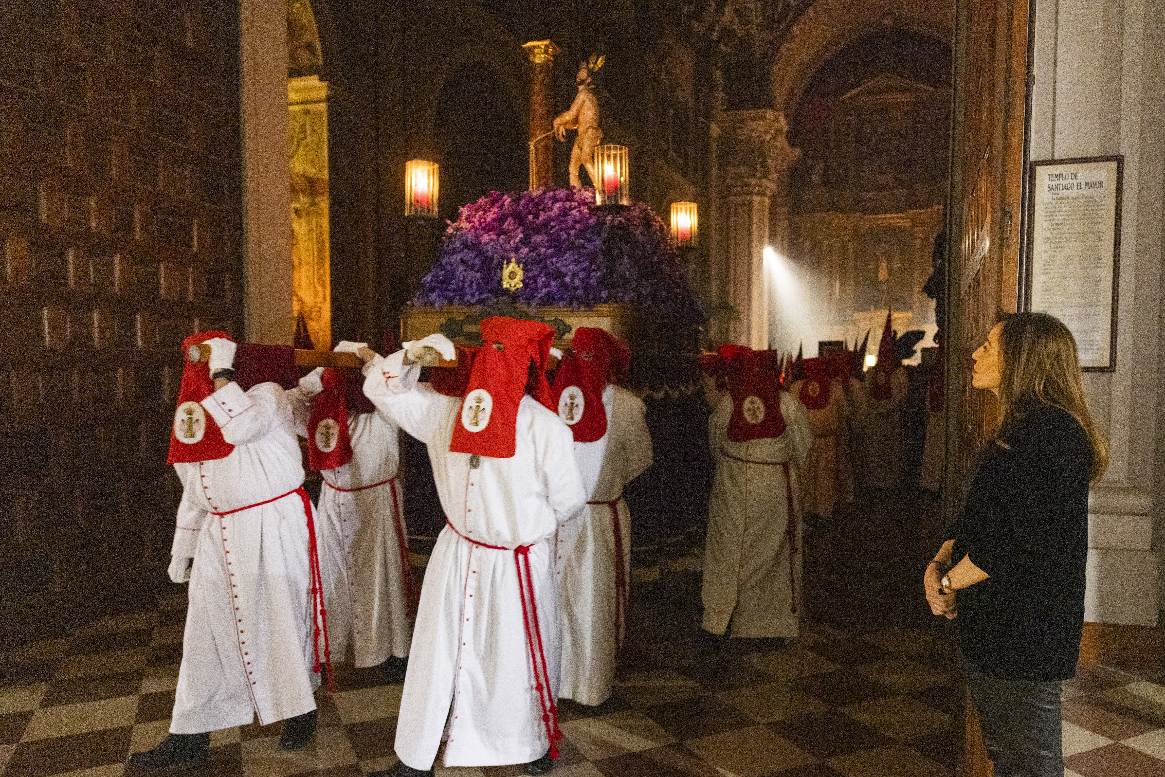 Natalia Chueca también ha querido estar con los hermanos de la cofradía de La Columna, una de las más grandes y que este año ha tenido dificultades en su salida como consecuencia de las obras que van a transformar y modernizar todo el entorno de su sede canónica, la iglesia de Santiago el Mayor.