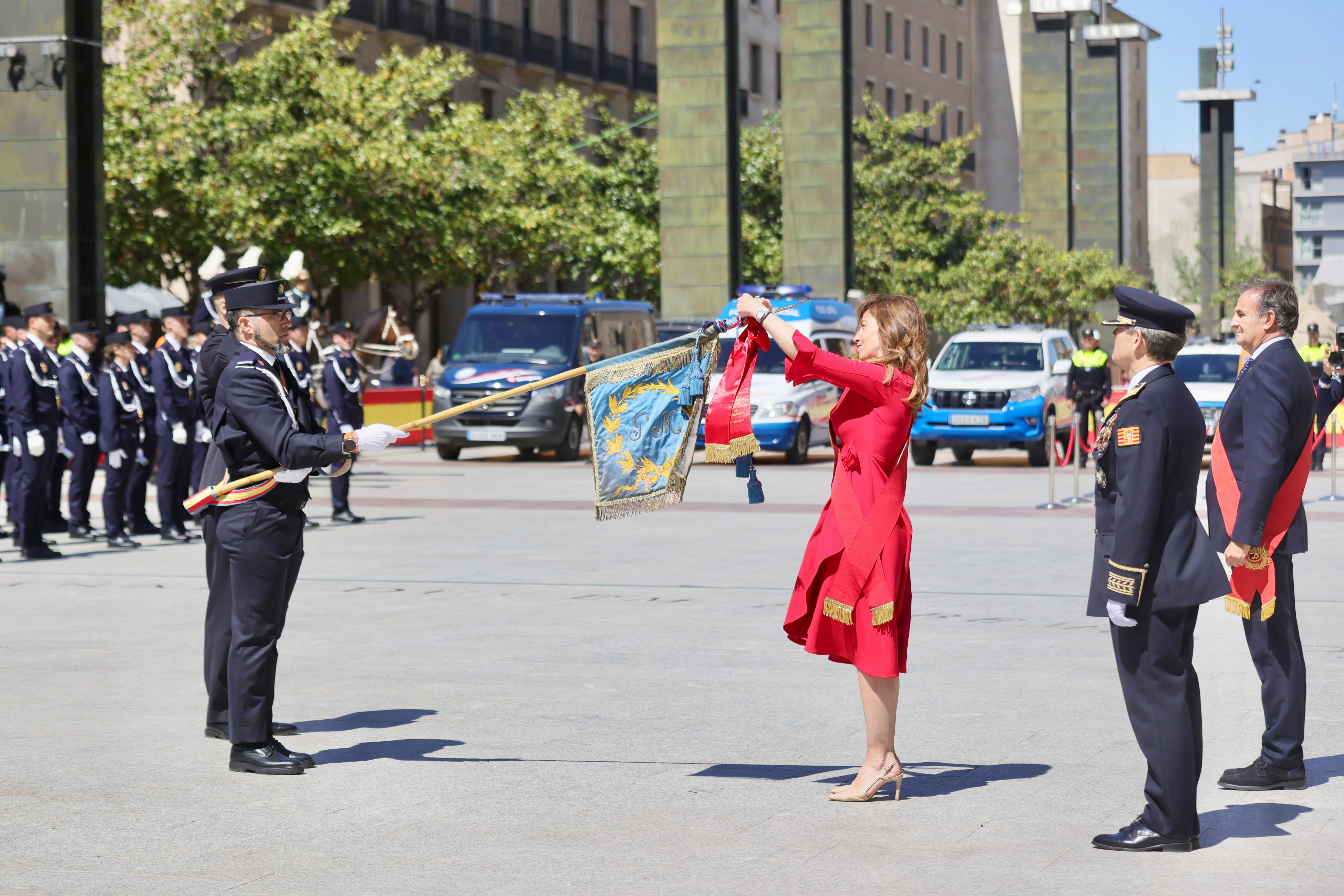 Unas palabras que han tenido lugar después de que la regidora y a su vez jefa de la Policía Local de Zaragoza haya colocado la corbata con la medalla sobre la bandera del Cuerpo, que estaba siendo portada por el superintendente de la Policía Local, Antonio Blas Soriano, y el consejero de Presidencia y Seguridad Ciudadana, Ángel Lorén.