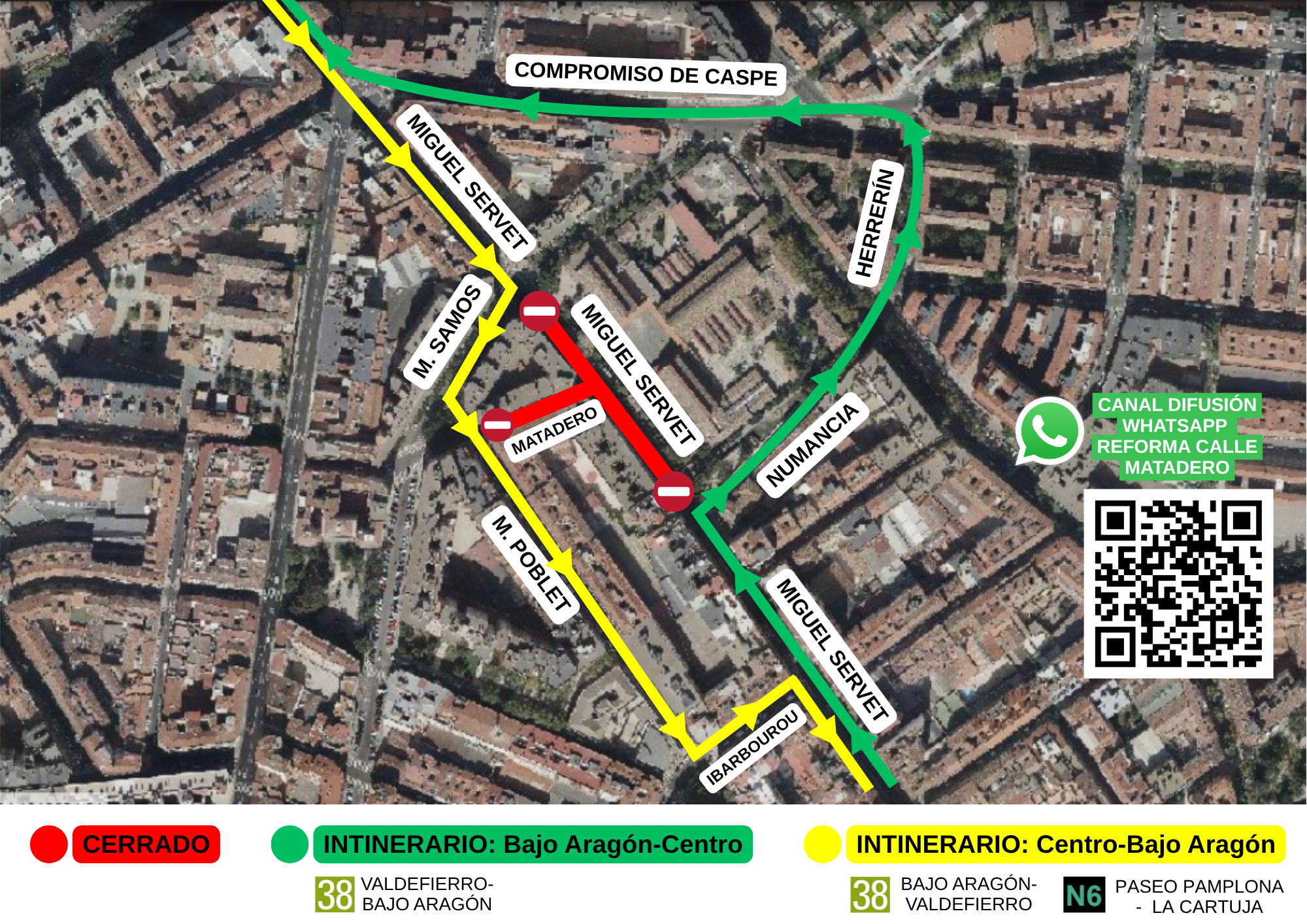 Esto supone que, desde el próximo martes 24 de junio, a las 8.30 horas, y hasta el 14 de julio se cortará, en ambos sentidos, el tramo de la calle de Miguel Servet entre las calles Numancia y Monasterio de Samos. Por ello, se han diseñado dos recorridos alternativos para el tráfico de vehículos y para las líneas 38 y N6 de autobuses urbanos, que se verán afectadas.