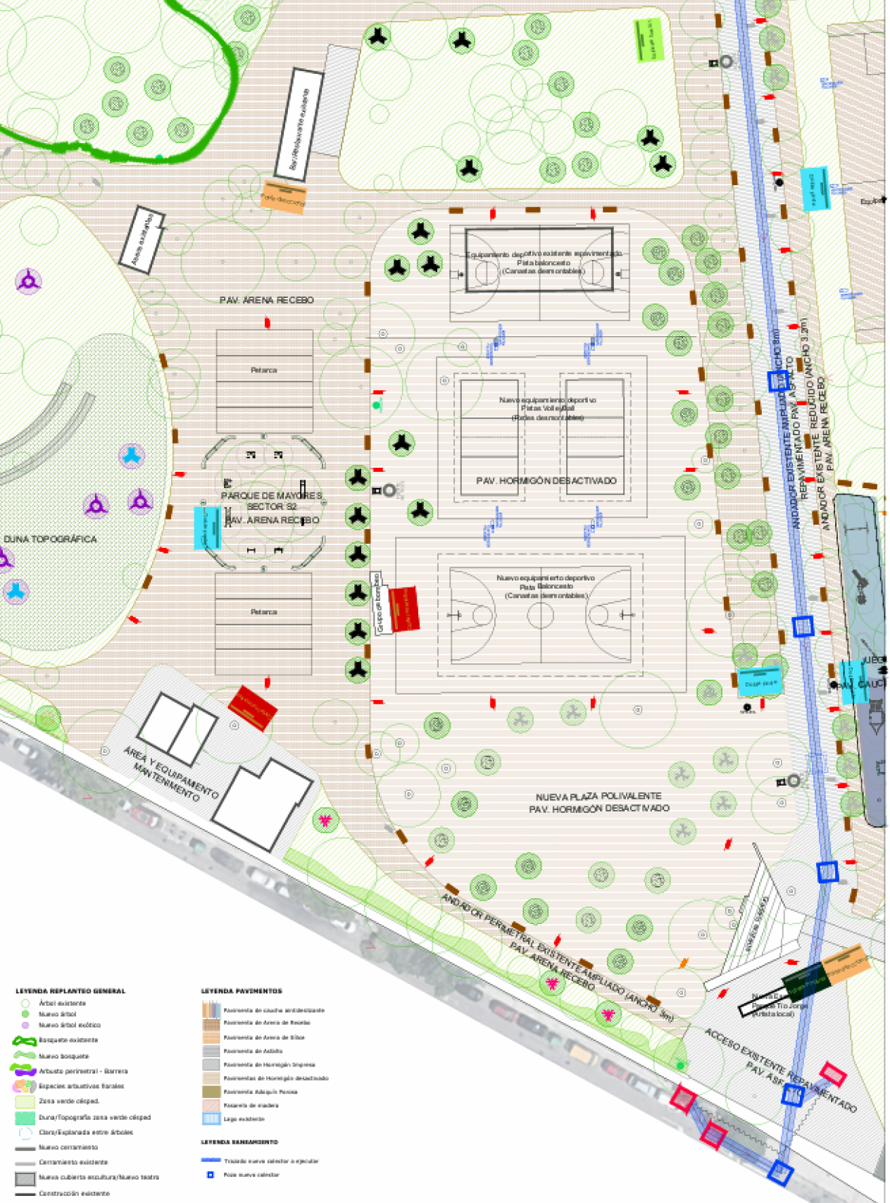 Además, y fruto de las propuestas vecinales, la primera fase de las obras incluirá la reorganización del espacio principal del parque, vinculado al propio bulevar central -a ambos lados de su zona sur-, para crear una plaza polivalente (que se llamará "Cinco de marzo") que sirva de espacio para usos diversos, como unas nuevas pistas deportivas y la organización de eventos. También se renovará la zona de juegos infantiles próxima al Centro Cívico Tío Jorge. Por último, se va a crear una zona que agrupará los espacios destinados a mantenimiento del parque en un único punto, de fácil acceso, para facilitar las