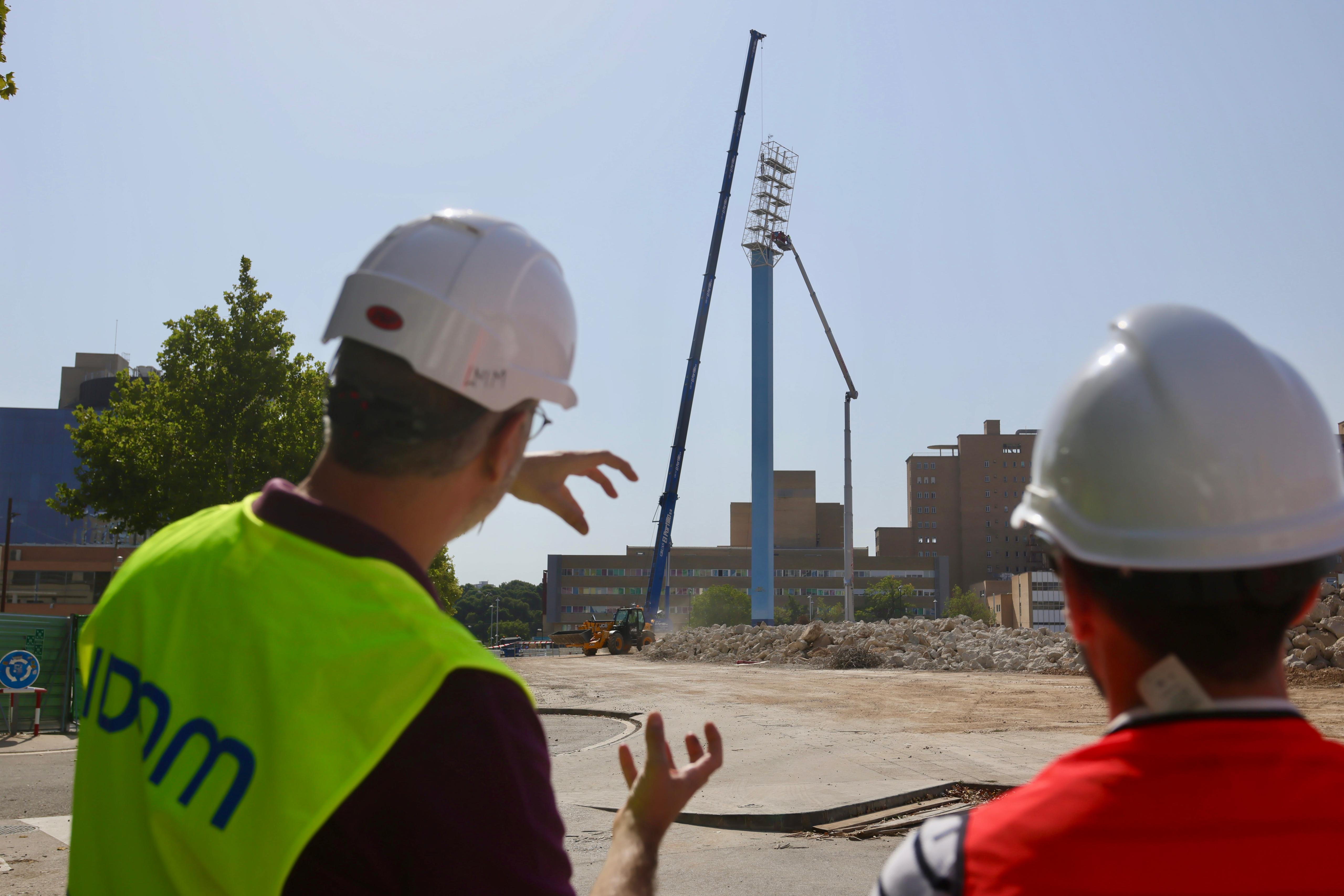 Cada una de las torres de iluminación tendrá que ser desmontada en tres fases. En primer lugar, se retirará la parrilla blanca de unos 10 metros de altura, donde se ubicaban los focos, junto a unos pocos metros de la reconocida columna azul. Los técnicos cortarán la estructura y la grúa autopropulsada, donde se habrá sujetado previamente la pieza, descenderá el elemento hasta el suelo. Después, se retirará otro tramo de unos 20 metros de la torre con el mismo sistema. Y, en última instancia, los 20 metros más cercanos al suelo serán demolidos directamente en cota cero con grandes máquinas que irán cizallando el material.