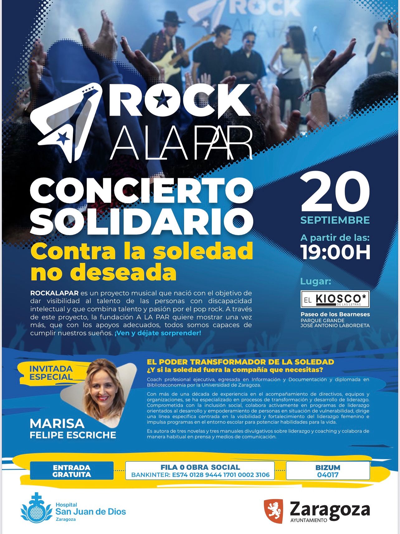 El Kiosco de las Letras acogerá este próximo sábado 20 de septiembre a las 19.00 horas un concierto solidario contra la soledad no deseada organizado por el Hospital San Juan de Dios de Zaragoza y que estará amenizado por el grupo Rock A LA PAR. Un evento gratuito que une música, inclusión y compromiso social, y que refuerza el compromiso del Consistorio con esta causa y el acompañamiento de las personas en todas las etapas de la vida.