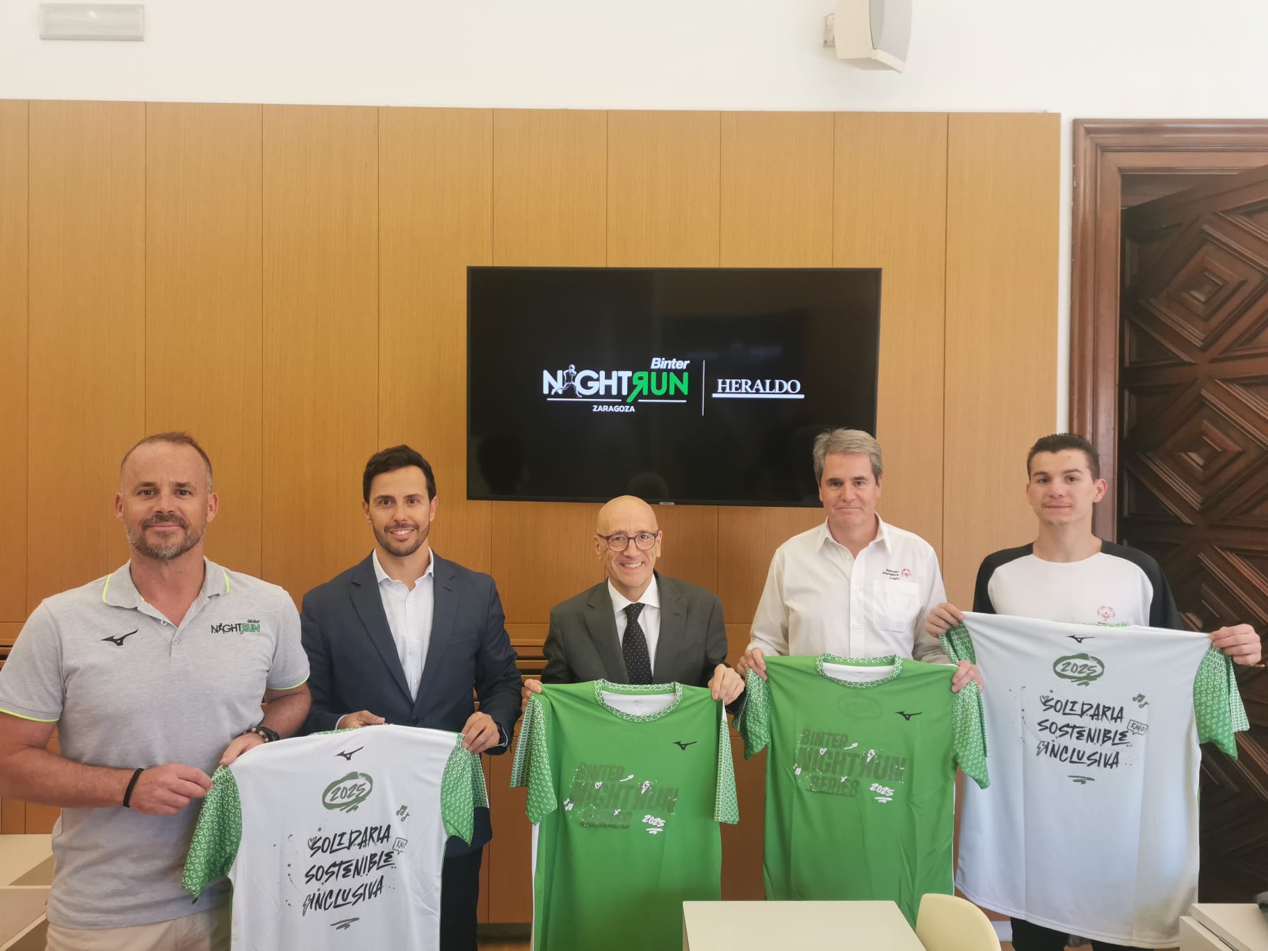 Zaragoza vivirá este sábado 27 de septiembre, por cuarto año consecutivo, la carrera nocturna Binter NightRun Series, con 1.700 participantes que teñirán de verde las riberas del Ebro y el casco histórico. El evento ha sido presentado hoy en el Ayuntamiento de Zaragoza por el concejal delegado de Deportes, Félix Brocarte, el jefe de Patrocinios de Binter, Alberto Guanche, y el gerente de DG Eventos, Daniel González. Ha asistido también Guillermo Ramos, presidente de Special Olympics Aragón.