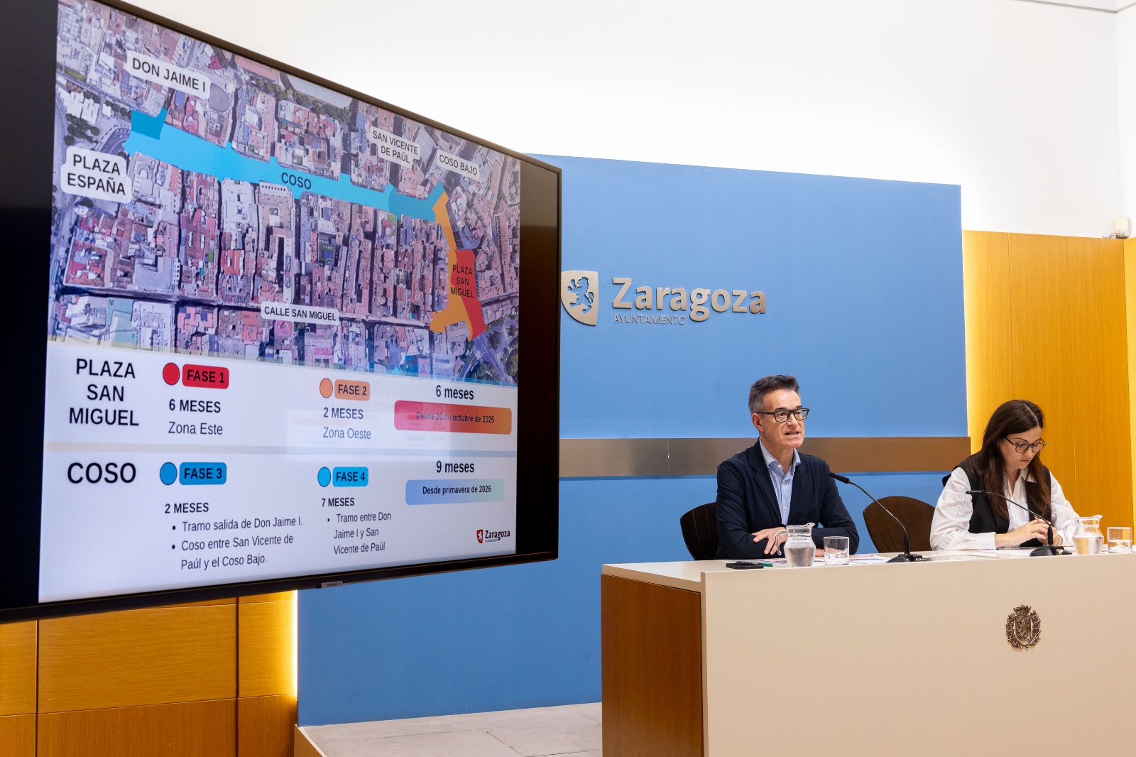 El Ayuntamiento de Zaragoza iniciará el próximo lunes 20 de octubre las obras de la reforma integral del Coso y de la plaza de San Miguel que se dividirán en cuatro fases: las dos primeras durarán un total de 6 meses y se concentrarán en la plaza, mientras que las dos fases restantes empezarán después sobre el Coso y conllevarán 9 meses.