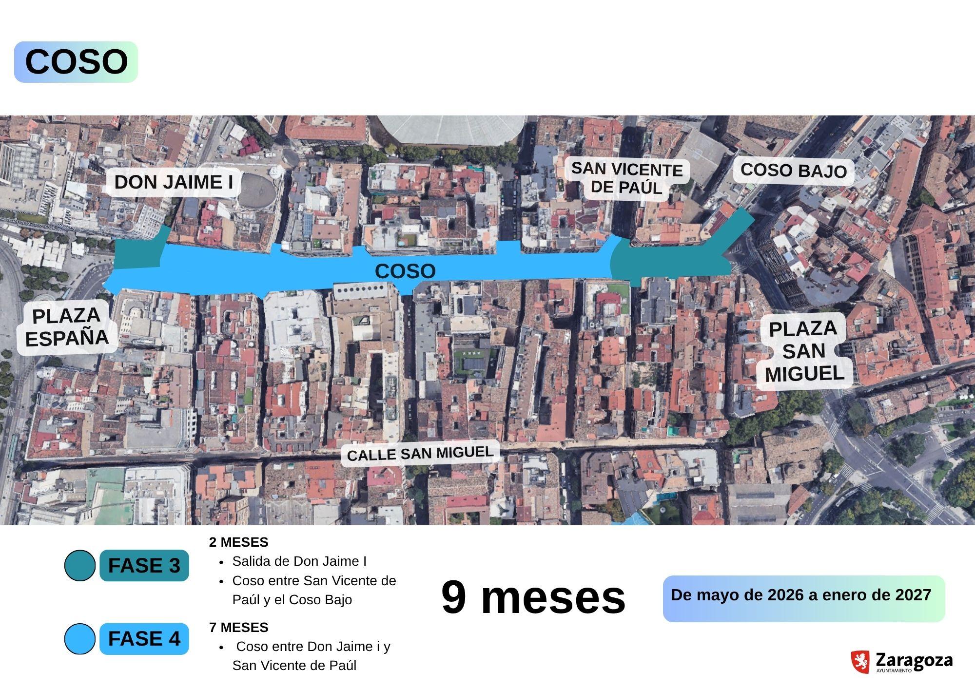 En mayo de 2026, una vez ejecutadas las obras en la plaza, los trabajos se trasladarán durante 9 meses al Coso, para lo que se han diseñado otras dos fases. En la denominada Fase 3 se trabajará 2 meses en total y abordarán las obras en dos pequeños tramos: en la salida de Don Jaime I y en la zona entre el San Vicente de Paúl y el Coso Bajo. Después, los trabajos se centrarán en la Fase 4, que duran otros 7 meses y se centran en el Coso desde plaza de España hasta San Vicente de Paúl.