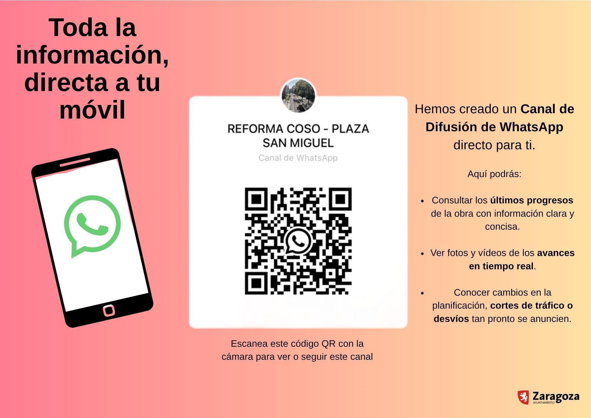 El sistema más directo para mantenerse informados y abierto a toda la ciudadanía será en Canal de Difusión de Whatsapp "Reforma Coso – Plaza San Miguel", que se puede seguir a través del enlace directo https://whatsapp.com/channel/0029Vb6zeOd5fM5Rz5uVIi2g o bien escaneando el código QR con la cámara del teléfono móvil para verlo o seguirlo.