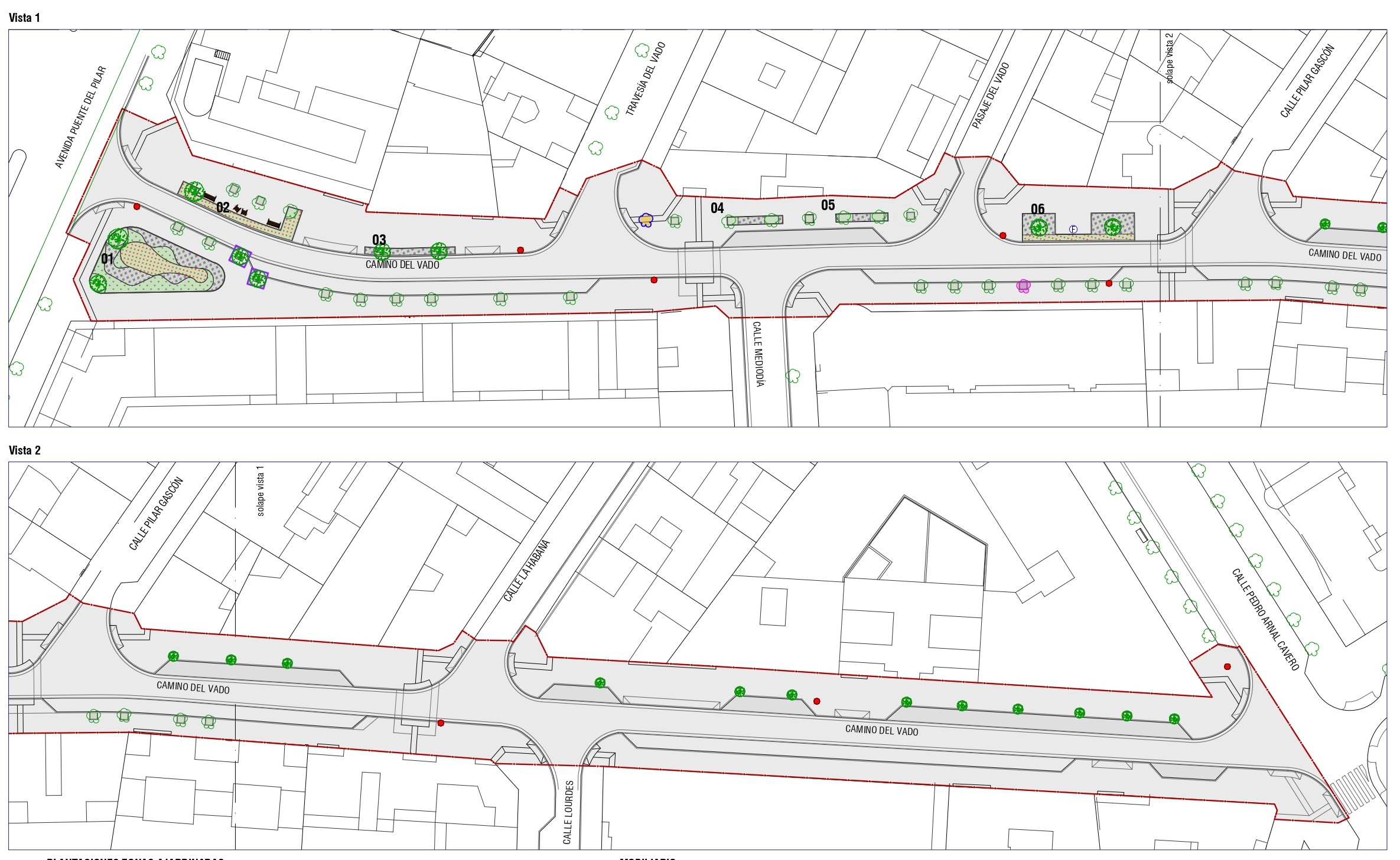 En lo referente a la renaturalización del espacio público, deberán apearse dos ejemplares de arbolado urbano y se contempla la plantación de 21 nuevos árboles, probablemente de ciruelos de jardín, así como el trasplante de un ejemplar de árbol de los farolillos. Además, se ha previsto la plantación de vegetación arbustiva en zonas ajardinadas con ejemplares arbustivos y florales. Todo ello completado con mobiliario urbano como bancos y sillas, tablones de madera tropical anexos a la zona ajardinada, ocho papeleras o la instalación de una fuente de agua potable con dos grifos, adaptada para mascotas.