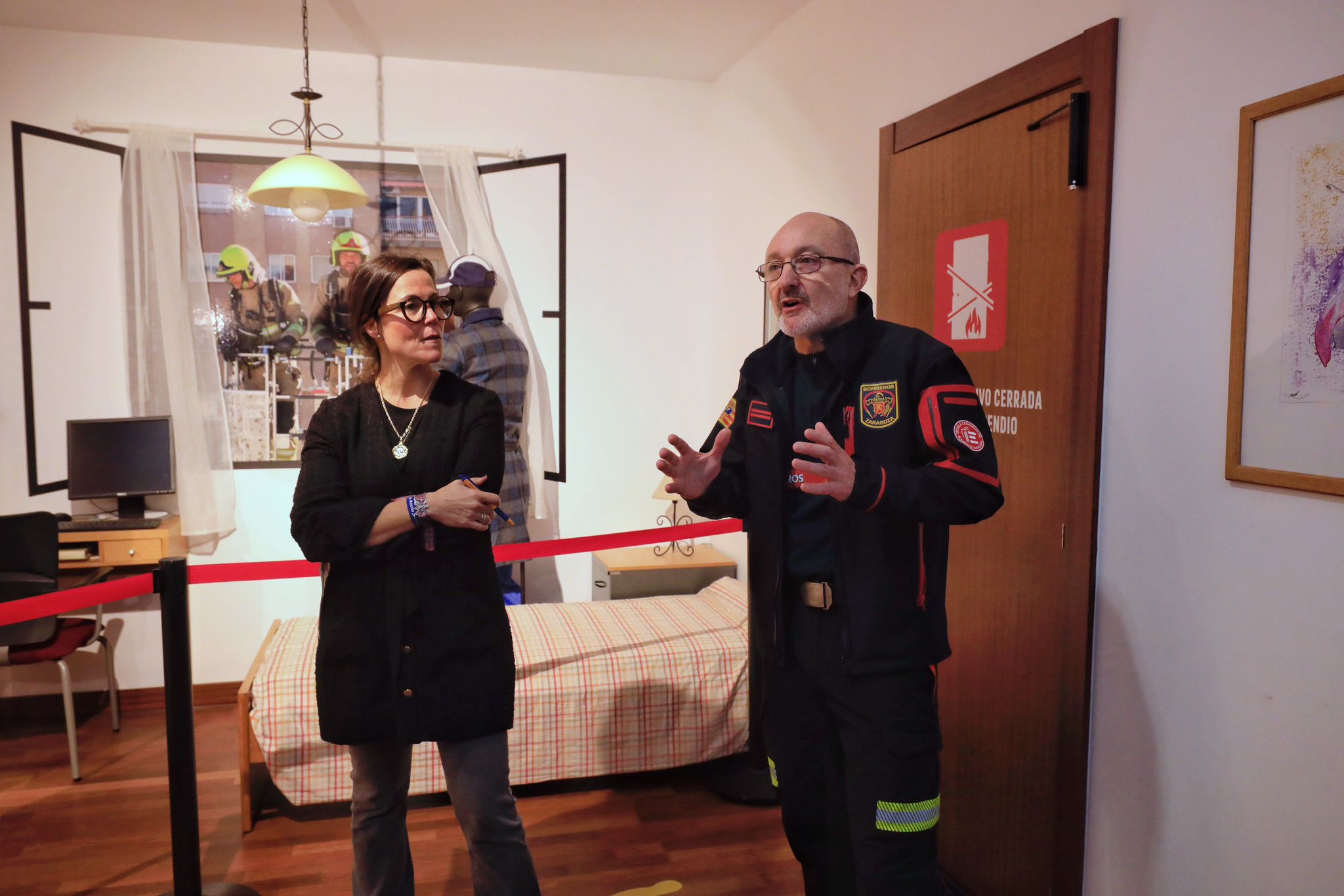 El recorrido comienza en un salón completamente calcinado, donde el visitante puede observar los efectos devastadores del fuego y comprobar, en este caso, que el incendio no ha afectado al resto de la vivienda. ¿Por qué? Porque la persona ha reparado en cerrar la puerta antes de salir, evitando que el fuego se propague por el resto del inmueble, para asomarse, a continuación, a la ventana de otra habitación con el fin de ser visto por los Bomberos.