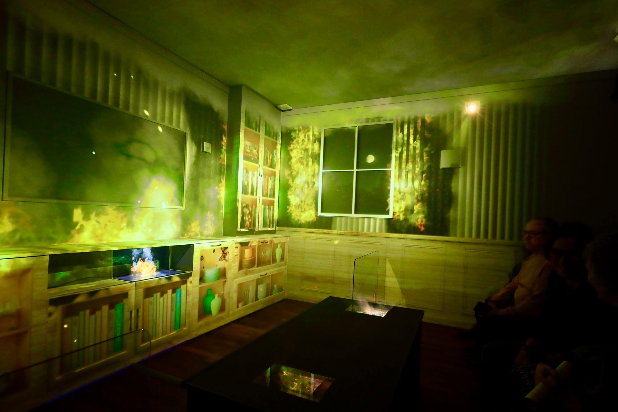 La experiencia se completa con la integración de un holograma situado en el propio mobiliario y con el uso coordinado de periféricos sensoriales, como máquinas de humo, impulsores de calor y un sistema de control de iluminación dinámica, que amplifican la sensación de presencia y tensión.
