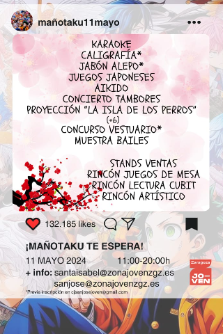 Jornada cultural Otaku dentro de las Jornadas J-PON. Con stands, actuaciones K-pop y J-pop, concurso de vestuario, talleres caligrafía japonesa, jabón Alepo, taichí, aikido, karaoke y cine fórum japonés, rincón juegos de mesa otaku, rincón de lectura, rincón artístico, concierto tambores japoneses...