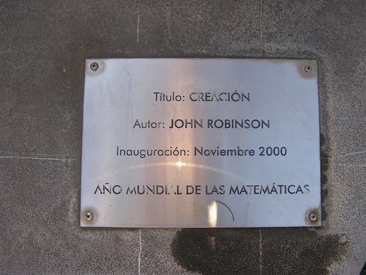 Donación del autor con ocasión de su exposición Simbolic Sculptures, que tuvo lugar en junio de 1991 en el Paraninfo de la Universidad de Zaragoza.Se instaló ante la fachada del edificio de la Sección de Matemáticas en noviembre de 2000 para conmemorar el Año Internacional de las Matemáticas.