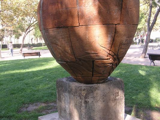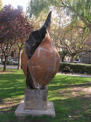 Sobre un pedestal en hormigón de sección cuadrada se coloca esta pieza cerámica de formas abstractas y silueta redondeada, cuya inspiración parece haber sido la propia naturaleza, de ahí su apariencia de semilla a punto de germinar. Quizá haya sido ésta su fuente de inspiración o, simplemente, este grupo de ceramistas quiso llevar a cabo una vasija sin utilidad alguna, con la intención de potenciar la cerámica creativa en pro de la tradicional, destinada esta última al uso, de ahí que la parte de la boca tenga apariencia quebrada y su interior esté lleno de material refractario.