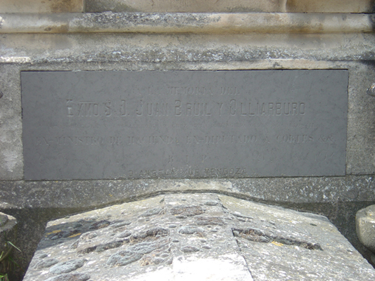 - Placa de marmol gris en el edículo, bajo el busto:"A LA MEMORIA DEL / EXMO. SR. DN. JUAN BRUIL Y OLLIARBURO / SENADOR DEL REYNO CABALLERO GRAN CRUZ DE LA ORDEN DE CARLOS III / EX-MINISTRO DE HACIENDA EX-DIPUTADO A CORTES && / 26 de febrero de 1812 - 21 de marzo de 1878 / R.I.P. / D. ÁNGELA MUR MENDOZA [su viuda]". Tallado en el busto, en el frente:"AÑO / JB / 1854". Inciso sobre el frontón del edículo, de nuevo el anagrama"JB" y bajo él la letra "Ω".