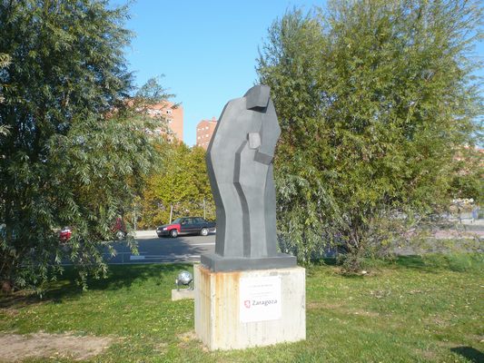 "EN HOMENAJE A TODAS LAS MADRES DEL MUNDO/LA MATERNIDAD/JUNTA DE DISTRITO/LAS FUENTES/ZARAGOZA/AYUNTAMIENTO/AUTOR: JACINTO RAMOS GRACIA/ 24 DE JUNIO DE 2006"(placa de metacrilato clavada en la cara frontal del pedestal de hormigón)