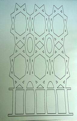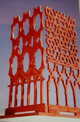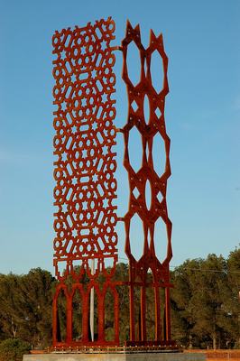 La escultura se compone de dos láminas en acero cortén, dispuestas en ángulo recto. Su lenguaje decorativo se basa en el gusto por las superficies rítmicas y uniformes mudéjares que ornamentaban planos enteros a partir de la repetición y prolongación de un motivo geométrico. En este caso, las dos láminas remarcan la relevancia de la simetría. Las líneas que se cruzan de forma ordenada se disponen de diferente manera en cada una de ellas y por tanto presentan diferentes motivos geométricos que se extienden por los dos planos. Una de ellas utiliza la prolongación en sentido vertical, horizontal y diagonal de los lados de un polígono estrellado, generando lazos y labores de seis (hexágonos, estrellas...). La otra, presenta estrellas de ocho puntas formadas a partir del giro del cuadrado y creando rombos y espacios circulares de unión. La superficies son de ejecución complicada y las ornamentaciones verdaderamente suntuosas. No obstante el uso de los elementos formales y ornamentales consigue dar un aspecto de ligereza y de belleza. Como toda pieza de arte público mantiene la monumentalidad y la abstracción, pero esta obra se convierte en un elemento visualmente identificable y cercano a la multiculturalidad otorgada por esa especial reinterpretación del arte mudéjar.