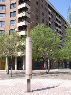 Bucle doble de acero bañado en bronce rematando una columna de 1,29 m. de diámetro formada por una viga de hierro de 4 m de altura y 14 cm de anchura forrada con lajas redondeadas de granito, hincada en una rosa de los vientos en mármol.