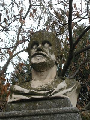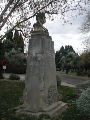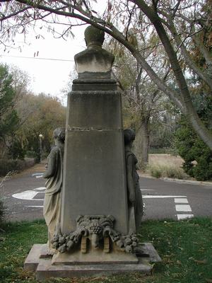 - Busto de 0,65 m. de altura sobre pedestal de 2,20 m. de alto en forma tronco-piramidal (de anchura máxima en la base de 1,20 x 1,20 m. y de 0,80 x 0,80 en el remate superior sobre el que se asientan los dos cuerpos rectangulares que sustentan el busto), con figuras en relieve de aproximación a tamaño natural. Del basamento actual (en forma de cruz griega rectangular, de 2,40 x 1,50 m.) se ha perdido el fuste en dos niveles con que contaba el monumento original.