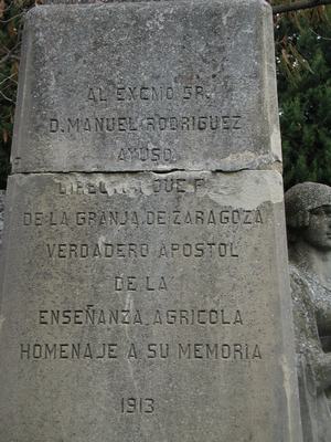 - "Al Excmo. Señor D. Manuel Rodríguez Ayuso, Director que fué de esta Granja, verdadero apóstol de la enseñanza agrícola. Homenaje a su memoria. 1913."
