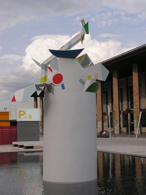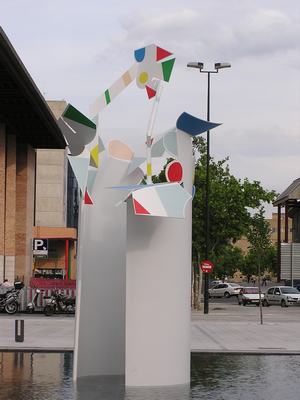 La abstracción con colores planos, con predominio del blanco contrastando con pequeñas áreas de diferentes colores son testimonio del magisterio de Mondrián; pero además de los colores primarios azul, rojo y amarillo, esta escultura de Mompó usa también secundarios como el verde, el rosa pálido, e incluso el gris, cosa que le aleja del neoplasticismo y hasta de Calder, que podría ser el otro referente, incluso por la práctica de realizar esculturas monumentales a partir de divertidos experimentos en pequeñas dimensiones. Si a eso se añade el hecho de que las formas no adoptan geometrías puras, sino que abundan los triángulos de color, y los pliegues irregulares en la chapa, más parece seguir esta escultura los precedentes argentinos del arte concreto o Madí. También podría asociarse el gesto de ampliar a escala monumental un modesto "florero" con prácticas de artistas Pop, como Claes Oldenburg. Pero en este caso el resultado no es muy afortunado, aunque la lámina de agua que rodea la obra sí es un acierto por los vibrantes reflejos que le añade.