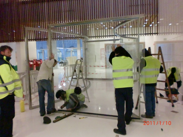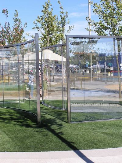 - Estructura en acero, seis paneles de vidrio curvado.