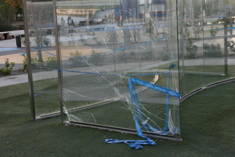 El pabellón de Dan Graham instalado en el recinto de la Exposición Internacional de Zaragoza 2008 bien pudiera ser descrito como la marquesina de un autobús desprovista de contenido pictórico alguno. En una entrevista realizada en 1995 para Journal of Contemporary Art, Graham mencionaba las que a su juicio eran las mejores piezas de arte público que se daban por entonces en Nueva York, destacando aquellas que se hacían eco de los elementos urbanos surgidos dentro del contexto arquitectónico neoyorquino, erosionando la frontera entre arte y arquitectura, irradiando un discurso conceptual cuyas líneas básicas eran la consciencia del ciudadano frente a la forma de su obra. De una estética limpia, el transcurso de su tiempo como artista ha hecho que Graham adopte gradualmente una postura más conceptual en sus propuestas, abandonando la teatralidad minimalista, para centrarse en la realización de piezas focalizadas en analizar la reacción del espectador más que en fabricarla.