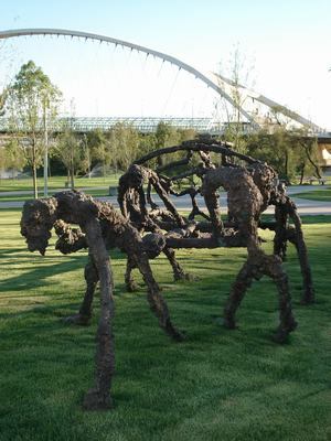 Con su peculiar estilo escultórico de figuras esquemáticas, como símbolos señaléticos, esta obra habla de los esfuerzos que debemos realizar los humanos para preservar el agua, el elemento más imprescindible para la supervivencia de nuestro planeta. La obra se ubica debajo de un puente y las figuras tiran de la carreta a contracorriente, lo que significa que la acción es doblemente costosa, que los esfuerzos para el mantenimiento de los recursos es algo colectivo y supone una concienciación social que va en contra de la utilización del agua de una manera indiscriminada.