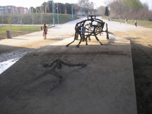 Instalación escultórica de 2 m. de alto x 12 m. de largo; hay una figura independiente del grupo escultórico, tumbada en el suelo, a tamaño real, aproximadamente.