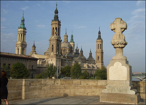 El monumento, instalado sobre la meseta de uno de los tajamares del Puente de Piedra, consiste en una cruz que se apoya sobre una corona de laurel, elemento tradicionalmente asociado a los vencedores y los héroes desde la antigüedad, de formas carnosas y sinuosas e inspiración levemente modernista, propia de la época.