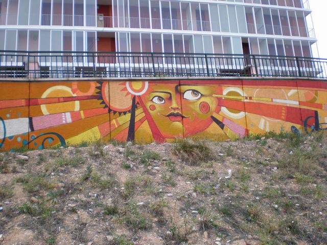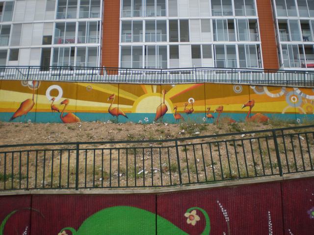La pintura realizada sobre este muro está formada por cuatro imágenes principales y los motivos decorativos que se intercalan entre éstas, a lo largo de los cuales se representa una imagen humanizada y paradisíaca de la Naturaleza. En primer lugar, empezando por la izquierda, aparece una imagen idílica formada por una puesta de sol en una playa poblada por flamencos. En segundo lugar, hay una original representación del sol con rostro humano y con los rayos convertidos en decoraciones de tipo geométrico. En tercer lugar, se representa una pareja completamente desnuda y en posición tumbada. En sus manos y sus cabezas llevan flores, mientras que sus cabellos ondulados parecen simular el fluir del agua. Uno de ellos sostiene un cántaro del que mana agua, por lo que esta pareja podría ser una alegoría del agua, de la vida, o quizá de los ríos. En último lugar, en el extremo derecha aparece el retrato de una joven, con una perspectiva lateral, de larga melena de color azul, cuyos mechones avanzan recreando el movimiento de las olas del mar. Podría ser una alegoría de los océanos o de los mares. Entre estas cuatro imágenes aparecen decoraciones de tipo geométrico y floral con cierto aire pop. Los personajes representados tienen el sello característico que Danger y Chiquita imprimen en sus obras, y que podemos ver, entre otros sitios, en el Tubo de Zaragoza.