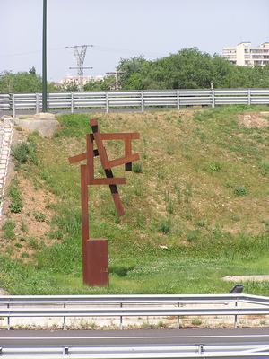 Sabina de Calanda consta de un alto plinto que sirve de contrapeso a un mástil o tronco sobre el que se entrecruzan listeles, recordando un poco los antiguos postes que antaño avisaban, a ambos lados de la vía férrea, de un paso a nivel sin barreras.